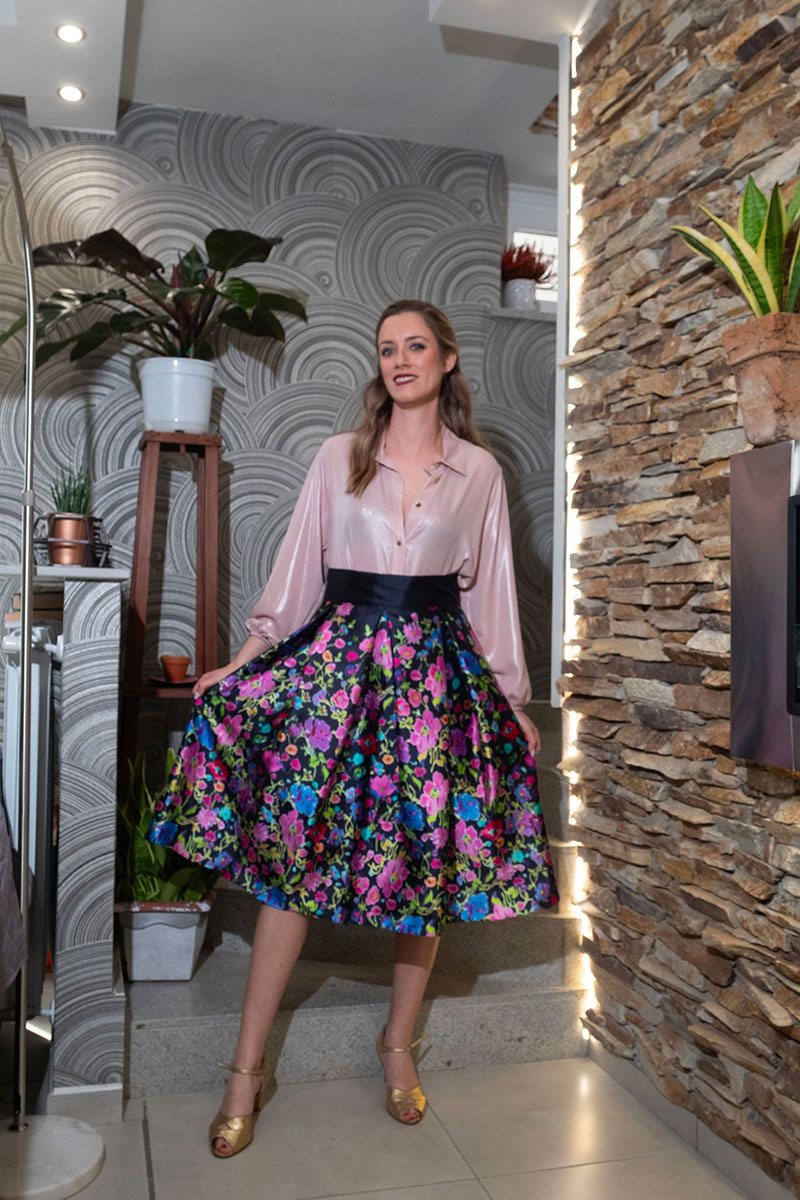 Gonna modello a ruota, lunghezza sopra le caviglie, realizzata in seta duccess con cinturino alto in vita.
