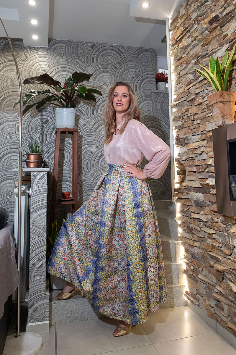 Gonna modello a ruota vita alta realizzata in seta ducccess.